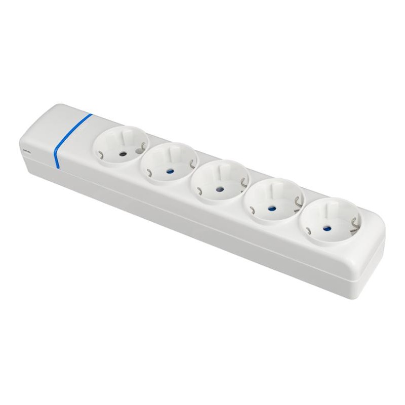 Base múltiple de 5 tomas 2P+T, 16A 250V~. MÁX.3680W. 850º C GWT Color blanco. Embornamiento de fácil acceso. Entradas para mini canal 7x12, 10x16, 10x20, y 12x12 mm. Tapa de extracción rápida y sencilla. Con agujeros para fijación mediante por tornillos a la pared y orificios para fijación mediante bridas a tubos, incluye pasamuros de goma para cable y tapa para mini canal. Fabricado en Policarbonato. Serie ION.
