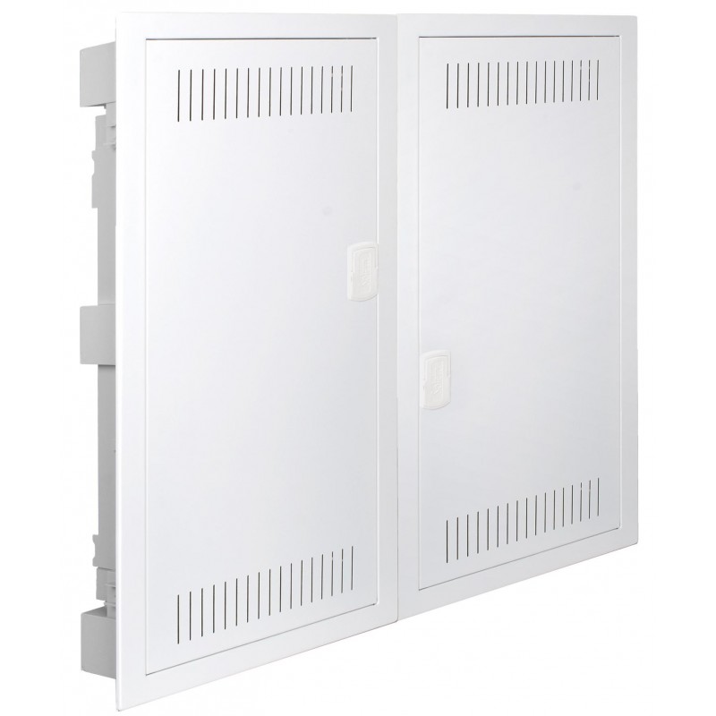 Caja material temoplástico color gris y marco y puerta metálicos con rejillas para para disipación de calor de color blanco. Dimensiones para empotrar 695 x 613 x 88 mm.